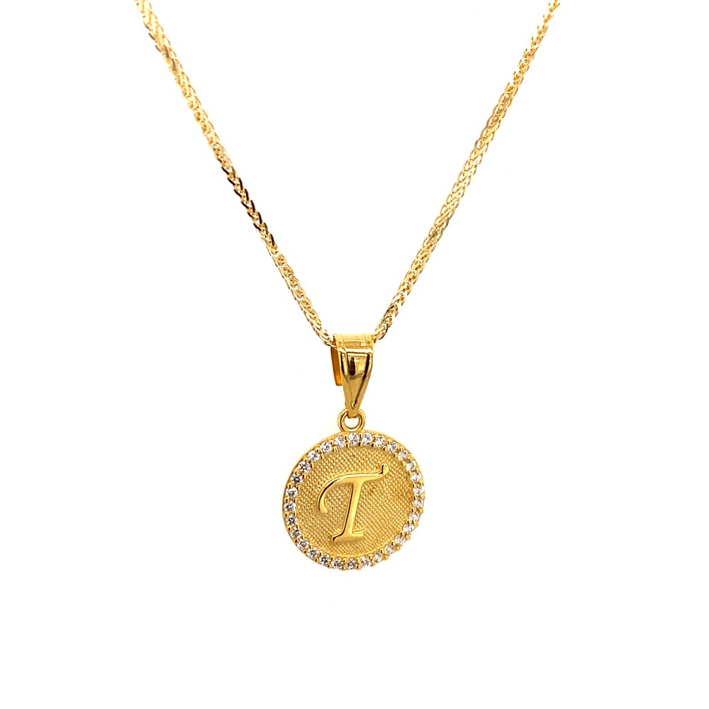 Μονόγραμμα μενταγιόν ''T'' σε χρυσό 14Κ με λευκά ζιργκόν περιμετρικά. Τιμή χωρίς αλυσίδα.
