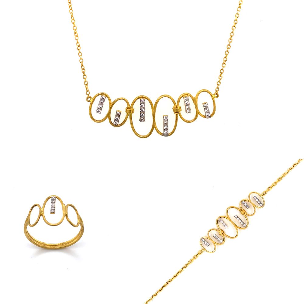 Εντυπωσιακό χειροποίητο σετ σε κίτρινο χρυσό 14Κ διακοσμημένο με λευκά ζιργκόν. Το σετ περιλαμβάνει βραχιόλι, δαχτυλίδι και μενταγιόν.