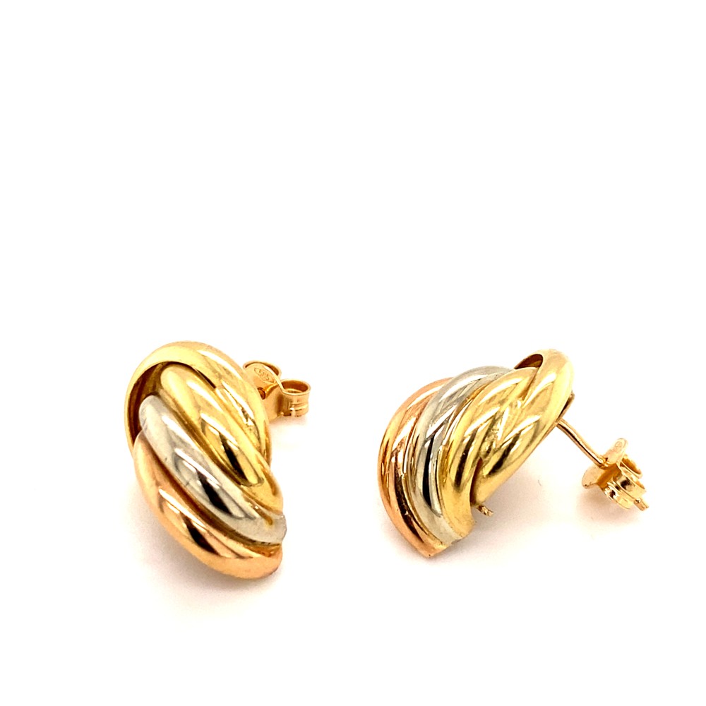 Γυναικεία σκουλαρίκια καρφωτά από χρυσό 14Κ σχέδιο κόμπος στα τρία χρ΄ωματα του χρυσού.