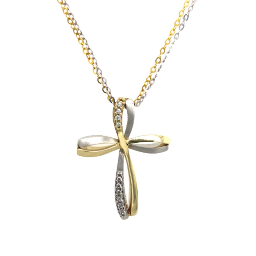 Σταυρός δίχρωμος με ζιργκόν από χρυσό 14Κ με διπλή αλύσιδα δίχρωμη.