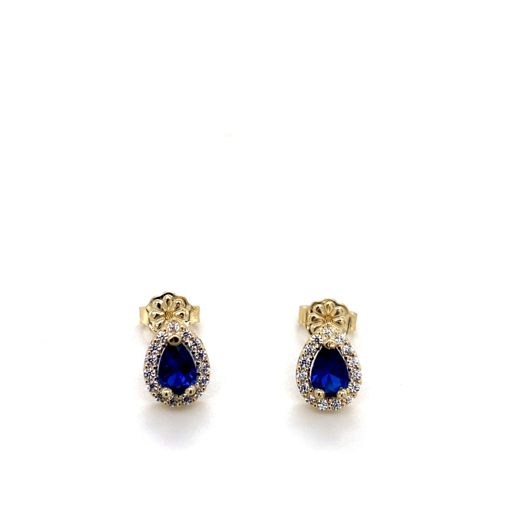 Σκουλαρίκι καρφωτό ροζέτα σε σχήμα σταγόνα από χρυσό 14Κ με στρογγυλή μπλε πέτρα.