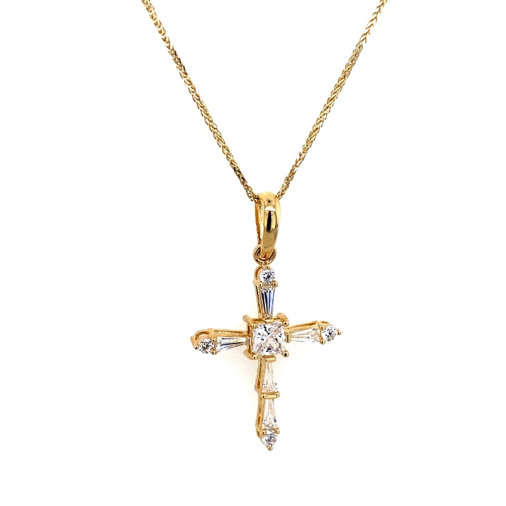 Γυναικείο σταυρουδάκι από χρυσό 14 καρατίων με λευκές πέτρες ζιργκόν κατά μήκος του.